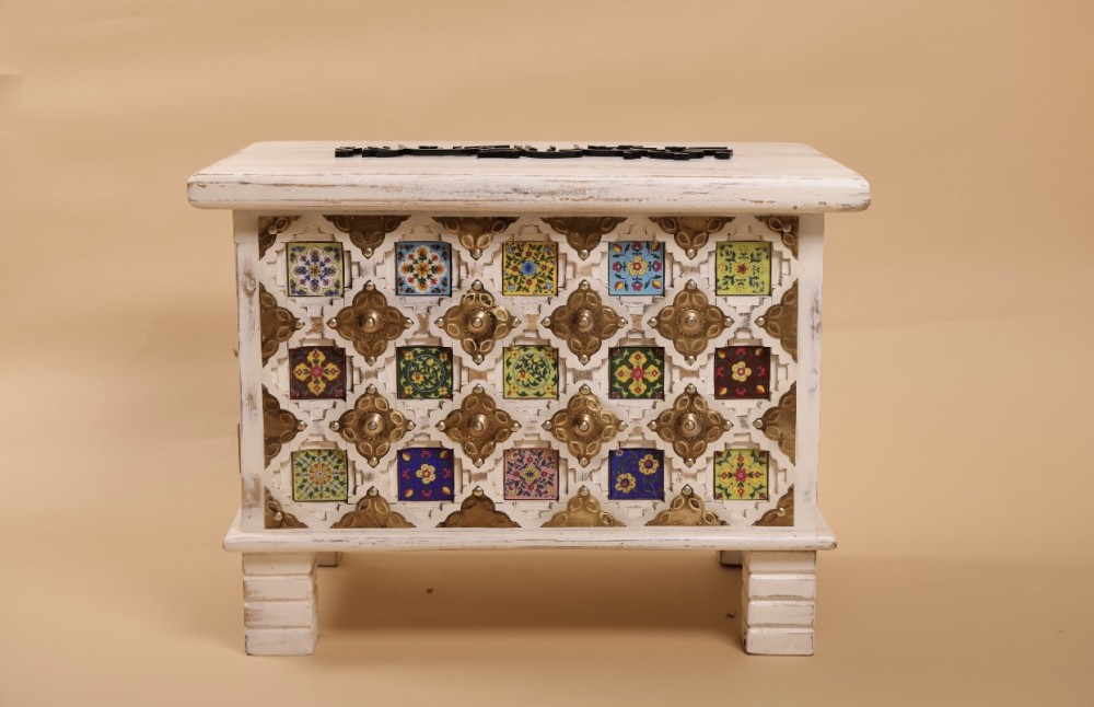 صندوق من الخشب الهندي مزخرف بنمط نقوش ملونه، مغلف بتغليف مناسب للاهداء