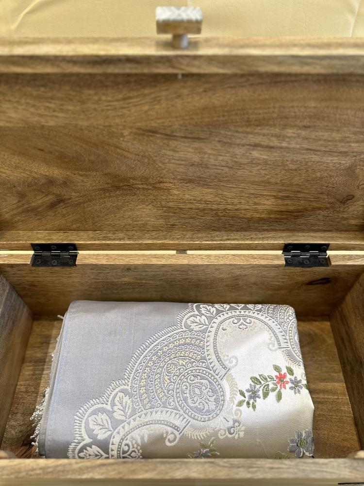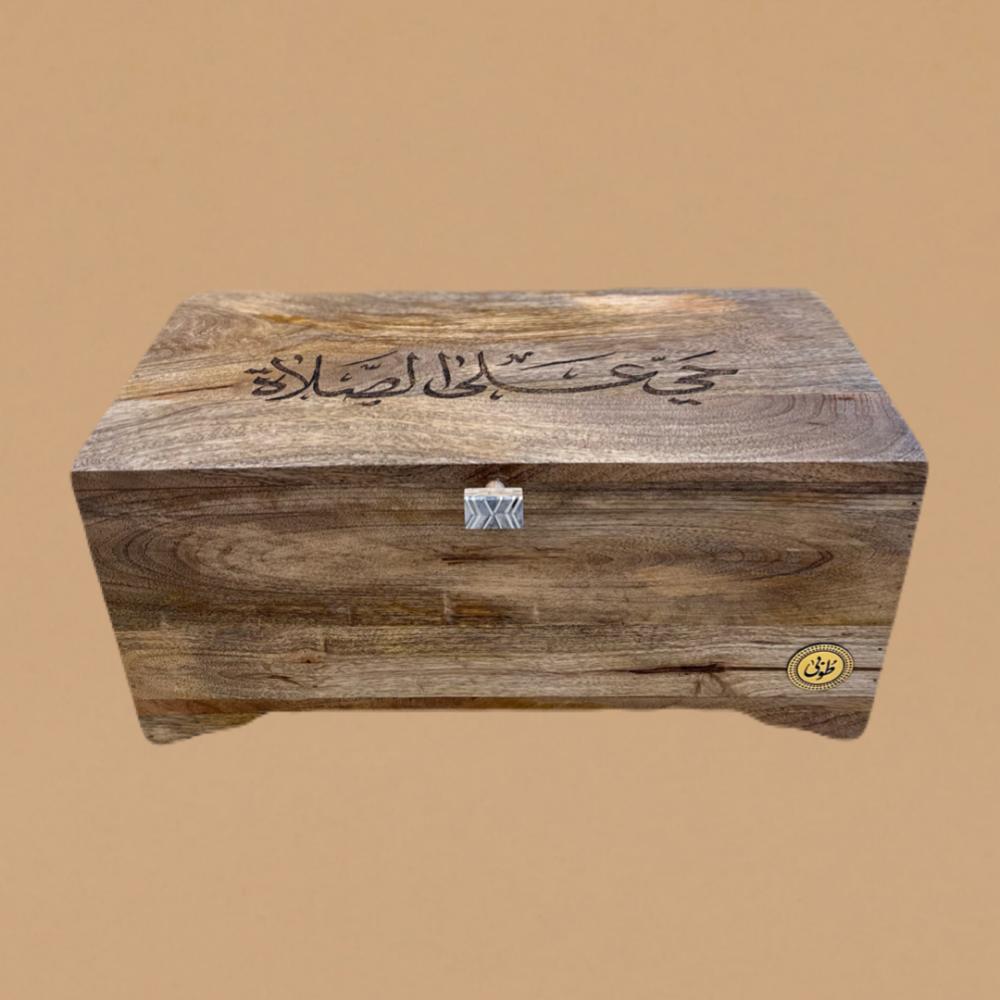 صندوق صلاة مستطيل محفور في اعلاه عباره حيّ على الصلاة مزين بمسكة من الحجر الطبيعي، يحتوي على طقمين صلاة ( سجادة و شرشف طرحة)