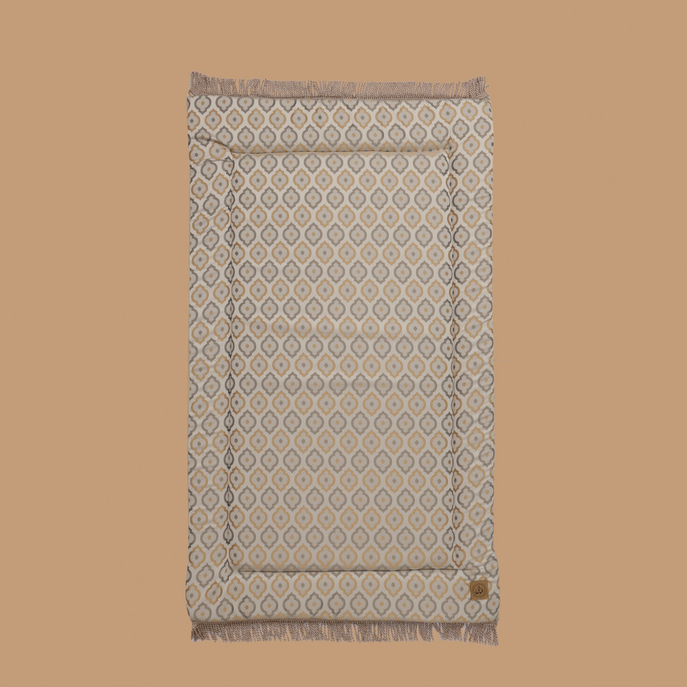 صممت هذه السجادة من قماش الجاكار بفرادتها و هدوء الوانها وتفاصيلها البسيطة.