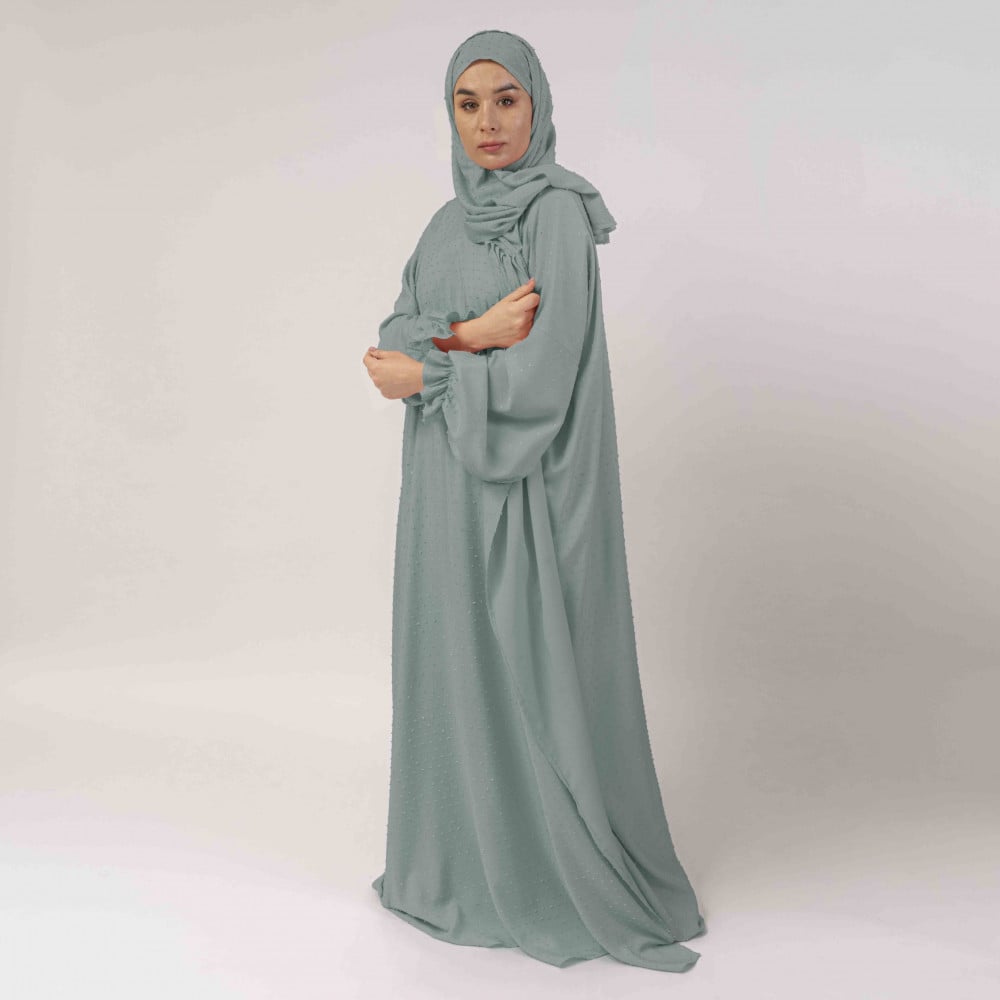 شرشف بقماش قطن مضاف اليه مواد طبيعيه .. بطرحه على الرأس مفتوح من الامام وباكمام مزمومه،  يتميز بانه بارد ومريح