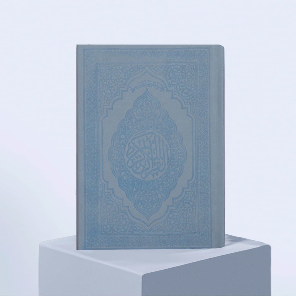 مصحف بغلاف من الجلد السماوي مزين بالزخارف المطبوعة بتقنية الليزر، بحجم 20*14 سم .