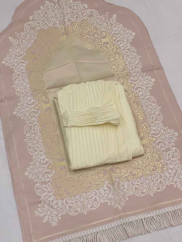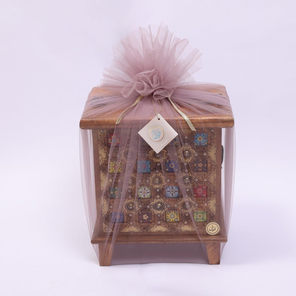 صندوق من الخشب الهندي مزخرف بنمط نقوش ملونه يحتوي على طقمين صلاة ( سجادة و شرشف طرحه ) مغلف بتغليف مناسب للاهداء