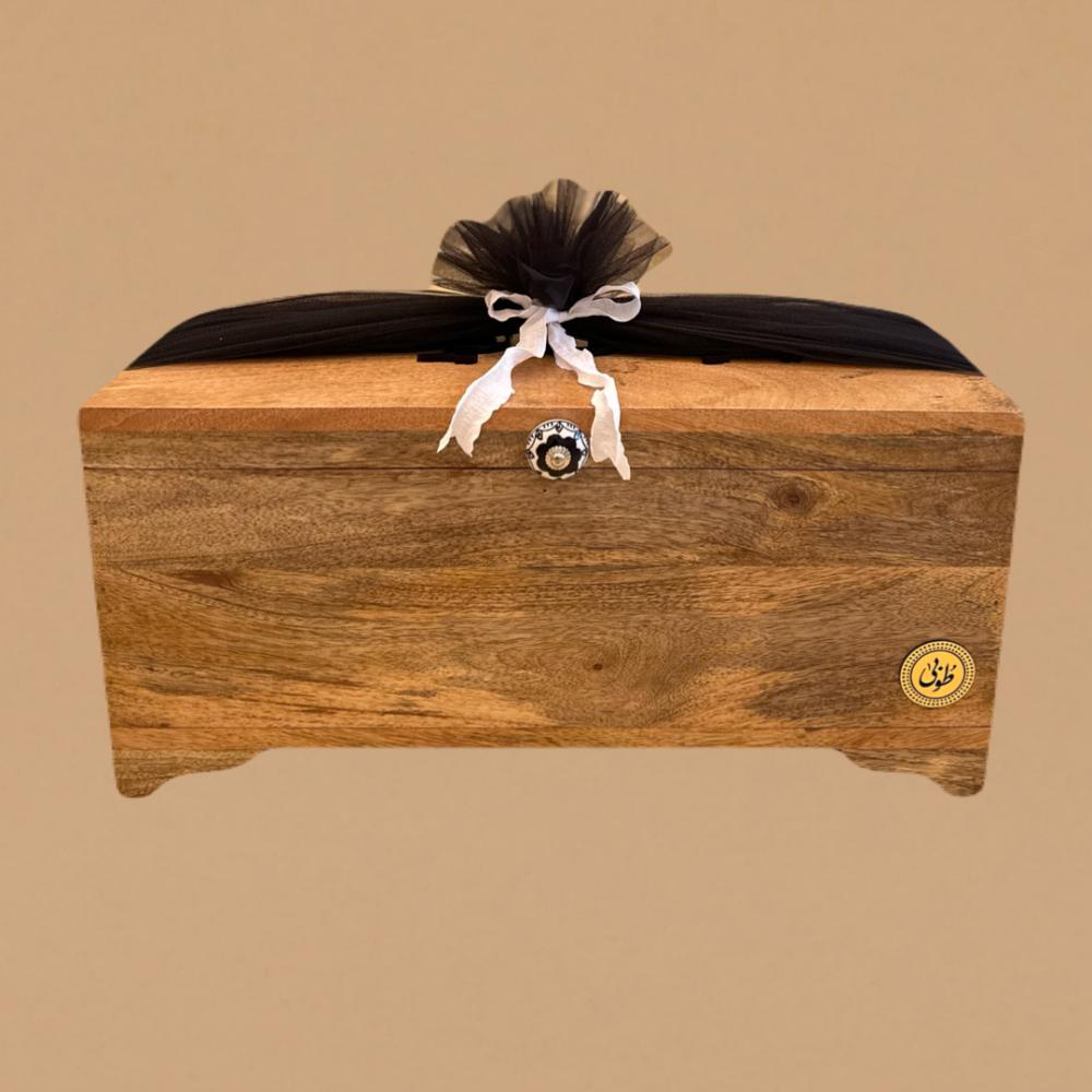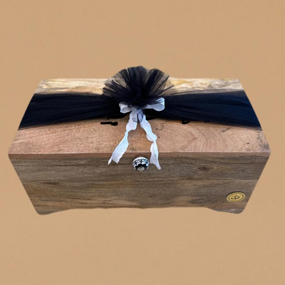 صندوق صلاة مستطيل في اعلاه عباره من الاكريليك ( حيّ على الصلاة) مزين بمسكة من الحجر الطبيعي، يحتوي على طقمين صلاة ( سجادة و شرشف طرحة)