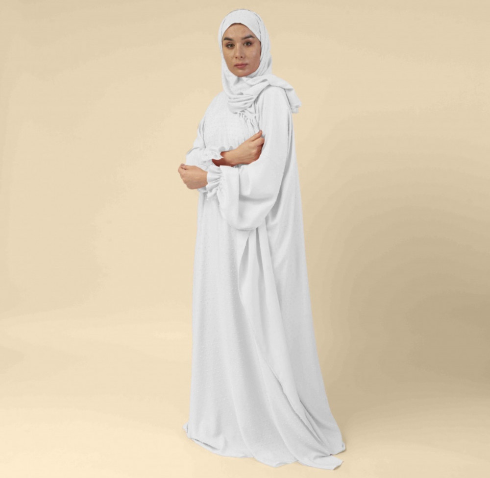 صمم هذا الطقم من سجادة من قماش الجاكار بفرادتها و هدوء الوانها  وتفاصيلها البسيطة   بالإضافة الى شرشف بقماش قطن مضاف اليه مواد طبيعيه .. بطرحه على الرأس مفتوح من الامام وباكمام مزمومه،  يتميز بانه بارد ومريح.