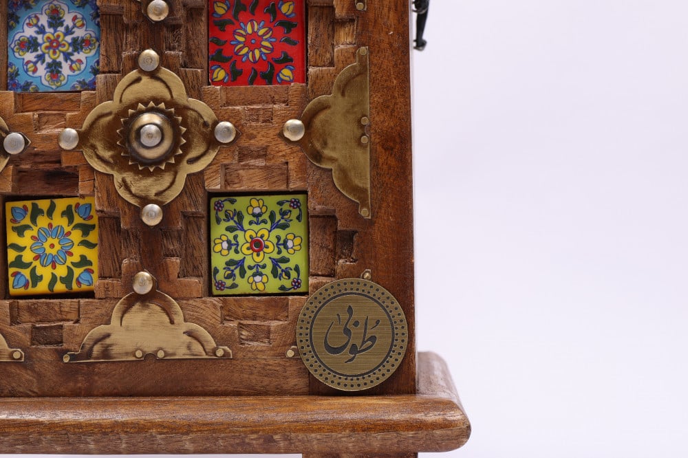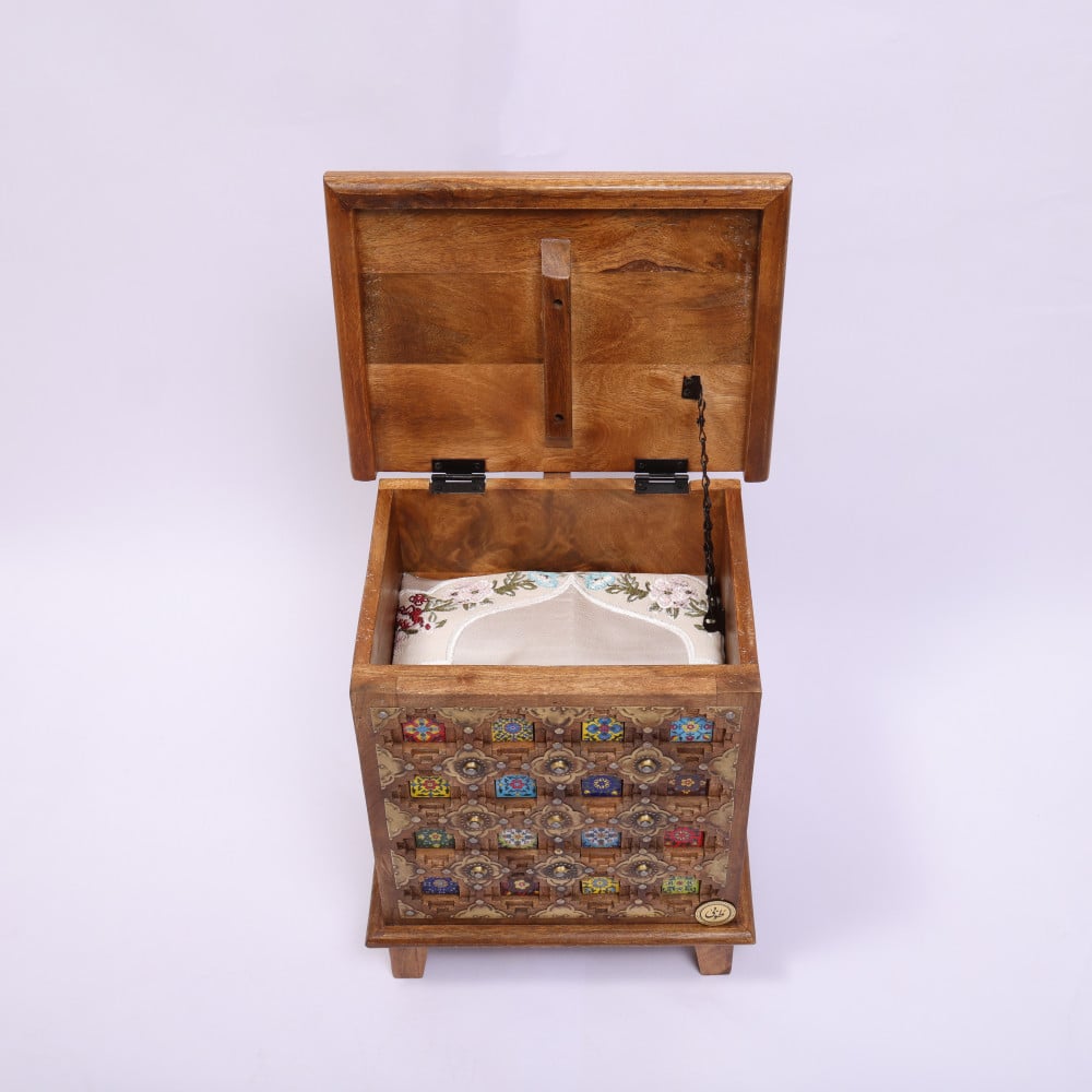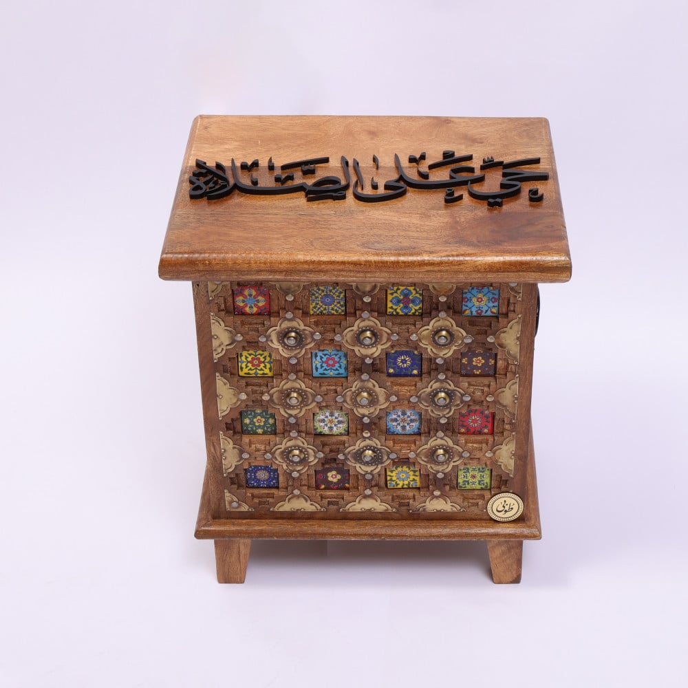 صندوق من الخشب الهندي مزخرف بنمط نقوش ملونه يحتوي على عدد 3 من اطقم الصلاة ( سجادة و شرشف طرحة مع كلفه على الاكمام) مغلف بتغليف مناسب للاهداء