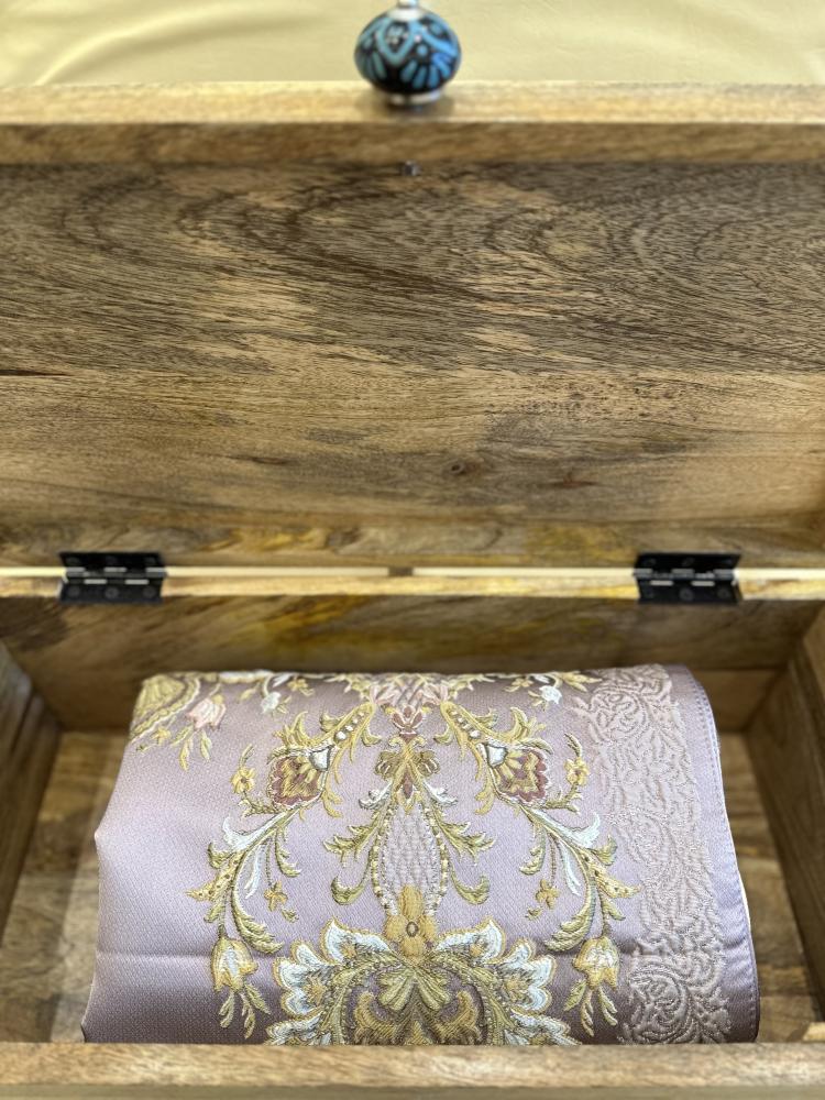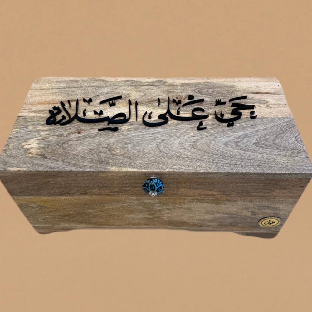 صندوق صلاة مستطيل في اعلاه عباره من الاكريليك ( حيّ على الصلاة ) مزين بمسكة من الحجر الطبيعي، يحتوي على طقمين صلاة ( سجادة و شرشف طرحة)
