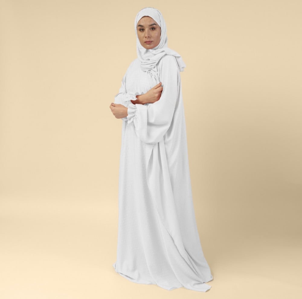 صمم هذا الطقم من سجادة مستوردة من تركيا بتفاصيلها المطرزه المبطنه بالاسفنج بالإضافة الى شرشف بقماش قطن مضاف اليه مواد طبيعيه .. بطرحه على الرأس مفتوح من الامام وباكمام مزمومه، يتميز بانه بارد ومريح