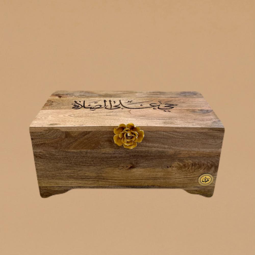 صندوق صلاة مستطيل محفور في اعلاه عباره حيّ على الصلاة مزين بمسكة من السيراميك عباره عن ورده ، يحتوي على طقمين صلاة ( سجادة و شرشف طرحة)